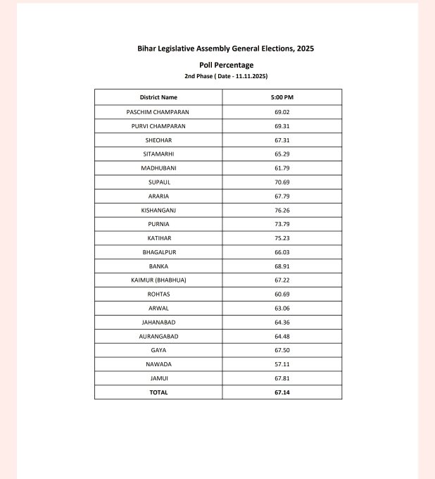 Bihar election 2025 phase 2 voting Live Updates: The battle of Bihar concludes, 67.14% turnout till 5 pm