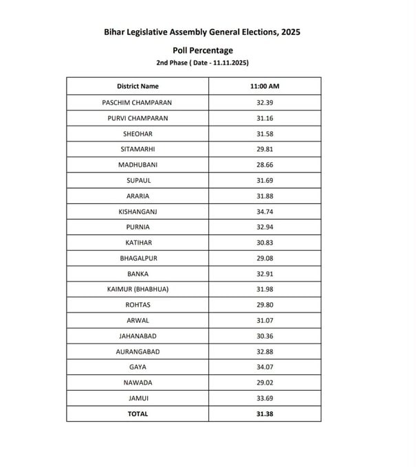 Bihar Election 2025 Phase 2 Voting Live Updates: A district-wise breakout of voter turnout till 11 am