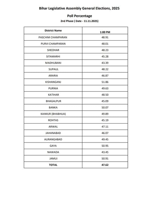 Bihar Election 2025 Phase 2 Voting Live Updates: Phase 2 nears 50% voter turnout till 1 pm