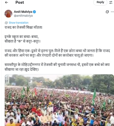 “RJD’s Tejaswi Education Model! In their school, every child learns “Ka” se Katta,” Malviya said.