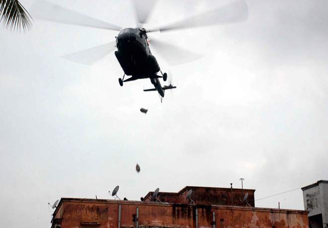 An Air Force helicopter drops relief material packets in the flooded area of Rajendra Nagar in Patna on Monday.