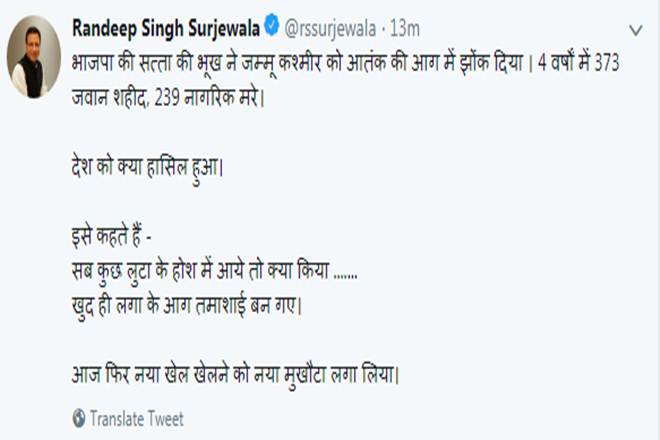 The opportunistic BJP-PDP alliance set fire to J&K, killing many innocent people including our brave soldiers. It cost India strategically & destroyed years of UPA’s hard work. The damage will continue under President’s rule. Incompetence, arrogance & hatred always fails.