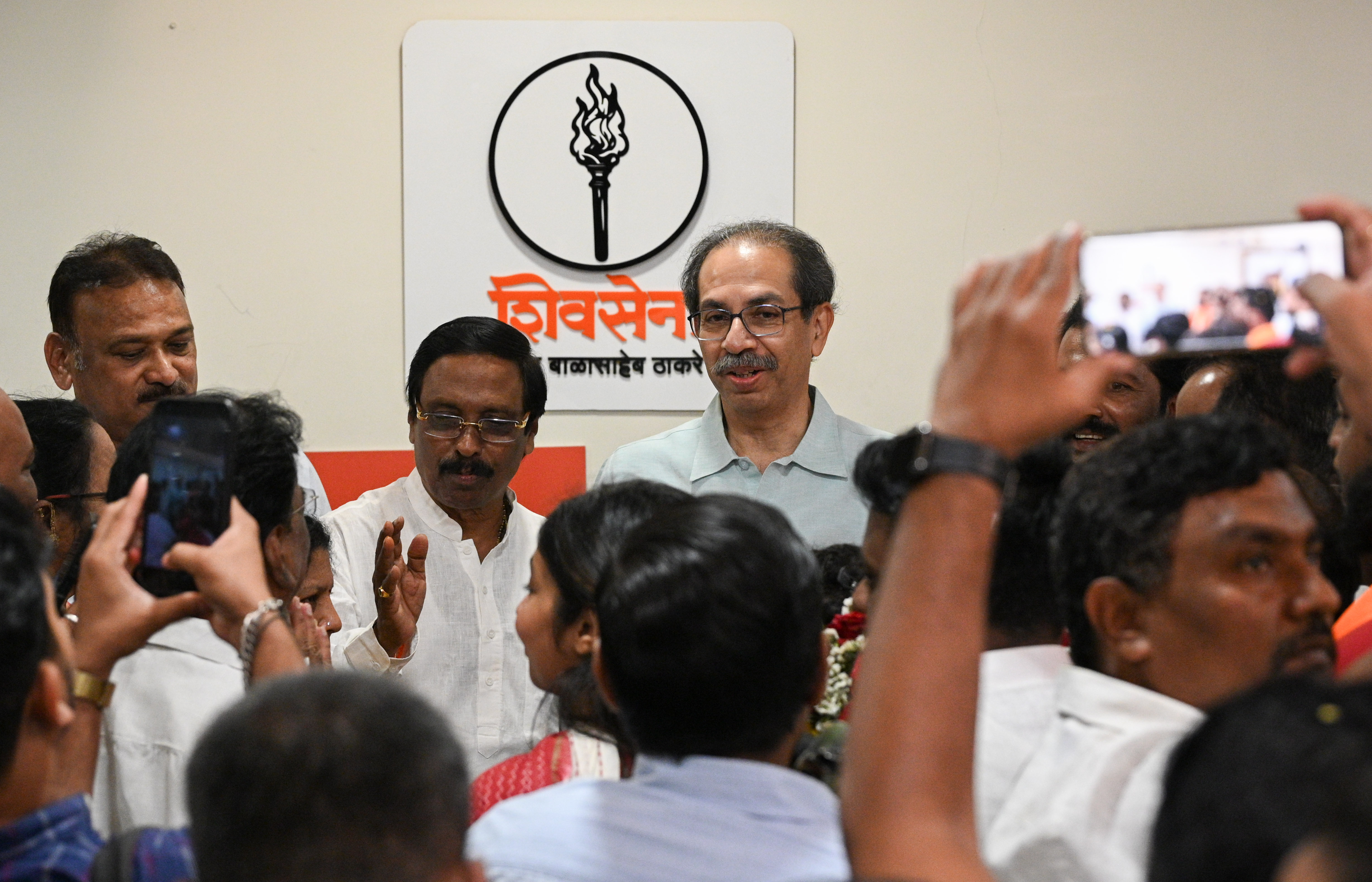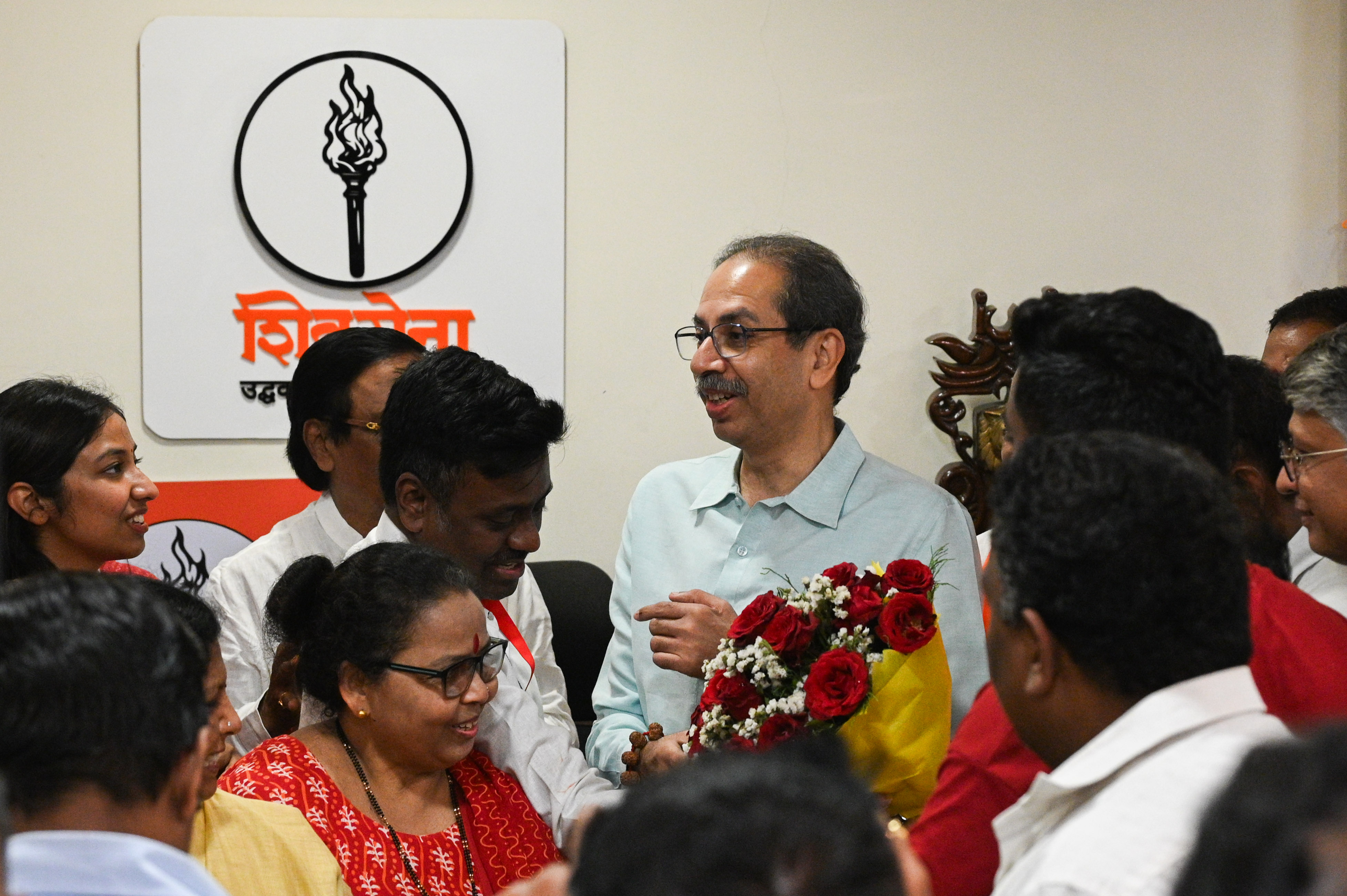 Shiv Sena (UBT) chief Uddhav Thackeray greets winning candidate Gitesh Vinayak Raut and his supporters from Ward No. 89 at his residence in Bandra East, Mumbai.
