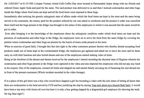 A few days back a customer, Arpan Verma was slapped by a female employee of the (CCD) outlet after he was seen capturing the crawling cockroaches inside the refrigerator on his camera. The video clip showed that a customer was taking a shoot of the refrigerator. A female staff asked him not to do. When he did not stop, she slapped him. And the video showing the staff slapping Arpan went viral on social media.