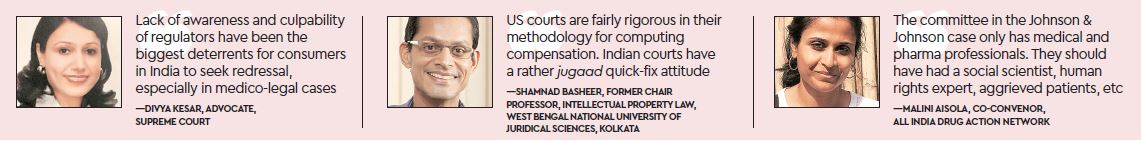 In the US, what works for the complainant is that damages are generally of two broad types: compensatory and punitive. Compensatory damages are categorised into economic damages that are directly attributable to various economic costs. Non-economic damages are for factors such as pain and suffering. More often than not, non-economic damages are far more significant than economic ones. “Illustratively, in the J&J case, a trial court in Los Angeles awarded damages of $8.3 million to an aggrieved patient, of which $8 million were damages for pain and suffering alone,” points out Basheer. He further states how punitive damages are meant to teach a lesson to the corporation, so that it deploys safer norms whilst manufacturing products and ensures that consumers are not harmed. “Compared to the US, the Indian legal system does not offer much, but this is changing slowly and courts are beginning to grant punitive damages in a larger number of cases now,” he adds.