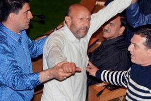 Controversial Independent MLA from Langate Sheikh Abdul Rashid was today detained along with several of his supporters as he tried to march towards the local office of the United Nations Military Observers Group.