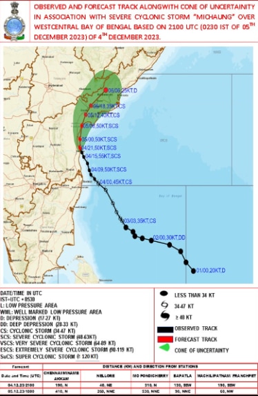 As per , Indian Meterological Department The Cyclonic storm ‘Michaung’ Likely to move nearly northwards parallel and close to south Andhra Pradesh coast and cross south Andhra Pradesh coast between Nellore and Machilipatnam, close to Bapatla during forenoon of 5th December as a Severe Cyclonic Storm. (Image : IMD)