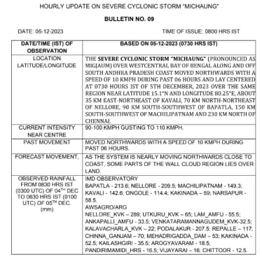 Latest IMD update indicates severe Cyclonic Storm “MICHAUNG” over Westcentral Bay of Bengal off south Andhra Pradesh and adjoining north Tamilnadu coasts moved northwards with a speed of 07 kmph during past 06 hours and lay centered at 0530 hours IST of today, the 5th December,2023.