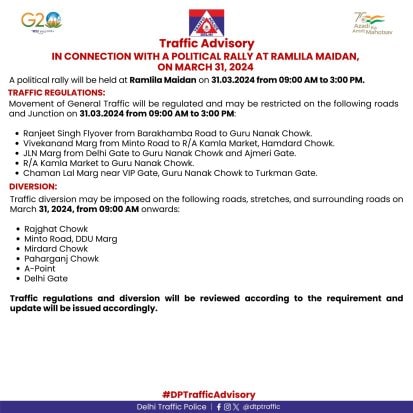 Furthermore, traffic diversions might be implemented at Rajghat Chowk, Minto Road, DDU Marg, Mirdard Chowk, Paharganj Chowk, A-Point, and Delhi Gate from 9 am onwards. The advisory emphasizes that traffic regulations and diversions will be subject to review as per the need, with updates issued accordingly.