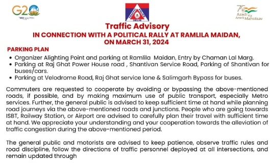 In view of the ‘Loktantra Bachao Rally’ organized by the opposition INDIA bloc on Sunday, the Delhi Police has issued a traffic advisory, indicating the regulation of vehicular movement in the city for a duration of six hours on that day, from 9 am- 3pm.