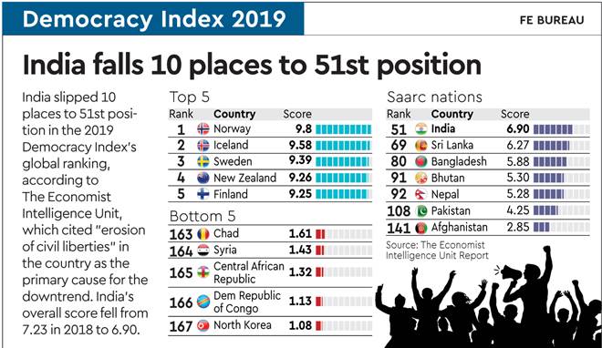 India slipped 10 places to 51st position in the 2019 Democracy Index’s global ranking, according to The Economist Intelligence Unit, which cited “erosion of civil liberties” in the country as the primary cause for the downtrend.
