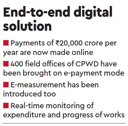 PFMS is an end-to-end solution for electronic processing payments, tracking fund flow, monitoring, accounting, reconciliation and reporting, etc. It has been adopted by the ministry of housing and urban affairs since October, 2015 by which the allocation of `34,000 crore has been transferred electronically. With CPWD now going digital, the volume of e-payments of the ministry and CPWD would be about Rs 60,000 crore during 2017-18. Since CPWD has a separate scheme of delegation of functions and financial powers, it required a special PFMS e-module for online transactions.