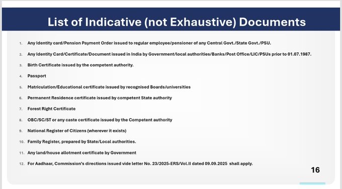 ECI shares list of Indicative (not Exhaustive) documents that people can produce if they are not found in 2003-04 voter list, and are not being able to be mapped up.