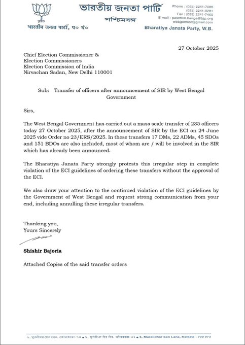 BJP West Bengal files a complaint to the Chief Election Commissioner regarding violation after the WB Govt transfers 235 officers — including 17 DMs, 22 ADMs, 45 SDOs & 151 BDOs — post SIR announcement.