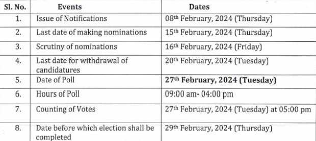 According to a official statement by the ECI, the notification for the polls will be issued on February 8 and the last date for filing nomination is February 15. The scrutiny of the nomination will be done on February 16. The candidates can withdraw their nomination till February 20.