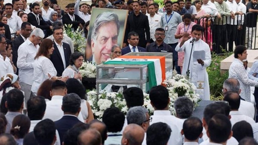 The mortal remains of Ratan Tata, the revered industrialist and philanthropist, are being taken from Mumbai’s National Centre for Performing Arts (NCPA) to Worli for his final rites. The solemn procession marks the final journey of a man who left an indelible mark on India’s industrial landscape and society.
