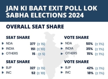 Based on the average of four exit polls, the BJP-led NDA is set to return to power with a commanding majority, securing around 365 seats. The opposition INDIA bloc will get 142 seats, while other parties will obtain about 36 seats.