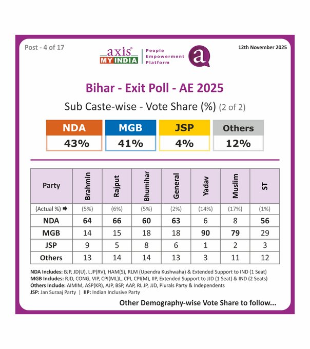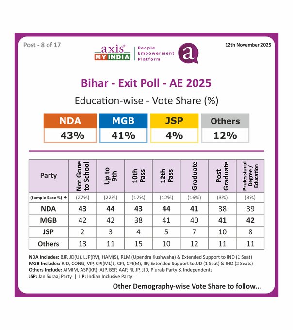 Bihar Exit Polls Result 2025 Live: More educated voters choose MGB over NDA, says AxisMyIndia