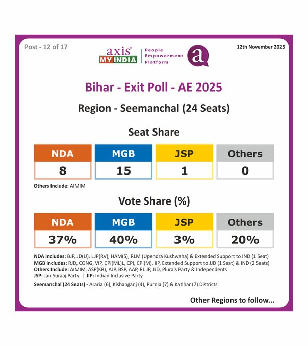 Bihar Exit Polls Result 2025 Live: Oppn projected to win Seemanchal, could win 15 of 24 seats - Axis My India