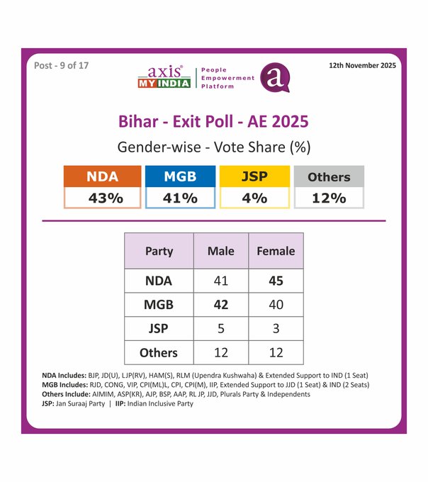 Axis My India exit poll suggests that 45% women voted for NDA and 40% for MGB, where as only 3% went for Jan Suraaj Party.