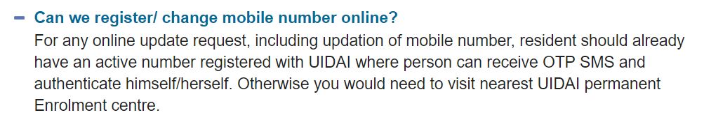 There are many people who have Aadhaar card but they have a question in mind – How to register mobile number online in Aadhaar card or how to change mobile number online in Aadhaar card online. So, here is the answer to this question. According to the answer given on UIDAI website in response to one of the Frequently Asked Questions, for any online update request in terms of Aadhaar number, including updation of mobile number, the resident should already have an active number registered with UIDAI. This number is important because by this number a person can receive OTP SMS and authenticate himself/herself. If your number is not registered, you would need to visit nearest UIDAI permanent enrolment centre.