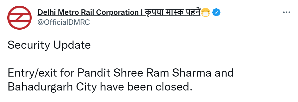 Farm Laws Protest Live Updates: Entry and exit gates for Bahudargarh City have been opened, informs Delhi Metro.