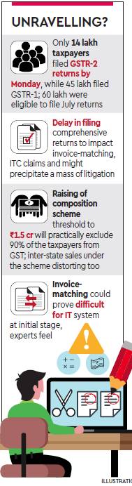 GST Network, which is the IT backbone of GST, estimates that about 80 crore invoices would be uploaded on to the system every month. A tax official said that even if 2-3 crore of the invoices don’t match, it will lead to numerous disputes, which would be arduous to resolve. “Besides, tax evasion takes place when transactions are off-book which will never be captured through invoices. The government needs precise and visible enforcement to minimise tax evasion,” the official said. To begin with, GST Council should have implemented matching at the GST level where sale and purchase are matched on the basis of the unique GST registration number of each taxpayer. Invoice matching should ideally have been brought in a few months later after the system stabilised. Now that some taxpayers are allowed to file returns only quarterly, the matching should also be harmonised with it and not be carried out every month.