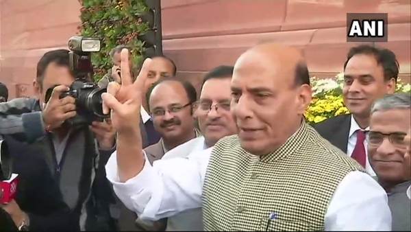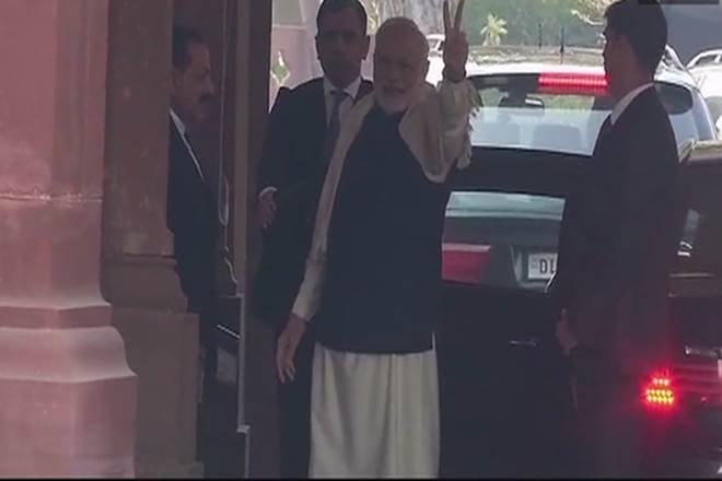 2:38 pm: Echoing his party’s mood, PM Modi flashed a victory sign after he arrived in Parliament here.