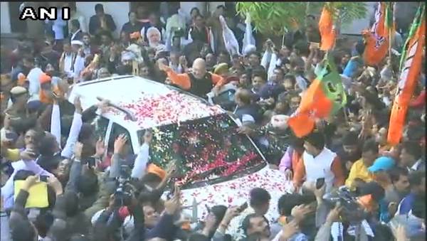 3:24 PM: BJP President Amit Shah arrives at party HQ as workers celebrate party’s lead in Gujarat and Himachal Pradesh.