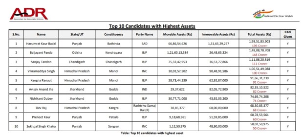 Shiromani Akali Dal (SAD) nominee from Punjab’s Bathinda is the richest candidate contesting in the seventh and last phase of Lok Sabha elections with assets worth over Rs 198 crore. She is followed by BJP candidate from Odisha’s Kendrapara Baijayant Panda with assets worth over Rs 148 crore. Following closely is another Sanjay Tandon, BJP candidate from Chandigarh, who has declared assets worth over Rs 111 crore, according to a report by Association for Democratic Reforms (ADR).