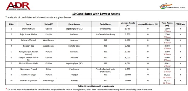 Among candidates with low assets are: Bhanumati Das contesting from SC-reserved constituency Jagatsinghpur in Odisha as Utkal Samaj party nominee has declared assets of Rs 1,500. The other two are Rajiv Kumar Mehra (Ludhiana, Punjab) from Jan Sewa Driver Party and Independent candidate Balaram Mandal (Jadavpur, West Bengal) have declared assets worth Rs 2,500 each.