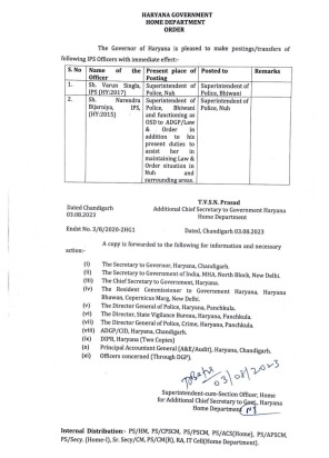 He has now been posted to Bhiwani. Singla’s Bhiwani counterpart, Narendra Bijarniya, will be the new SP of Nuh, according to a government order issued on August 3 by additional chief secretary (Home) TVSN Prasad.