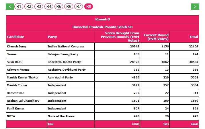 In round 3 of counting, BJP candidate Sukh Ram has taken lead and so far he has got 9,188 votes, and Kirnesh Jung has got 7,237 votes. AAP candidate Manish Kumar Thakur has so far got 1,387 votes.