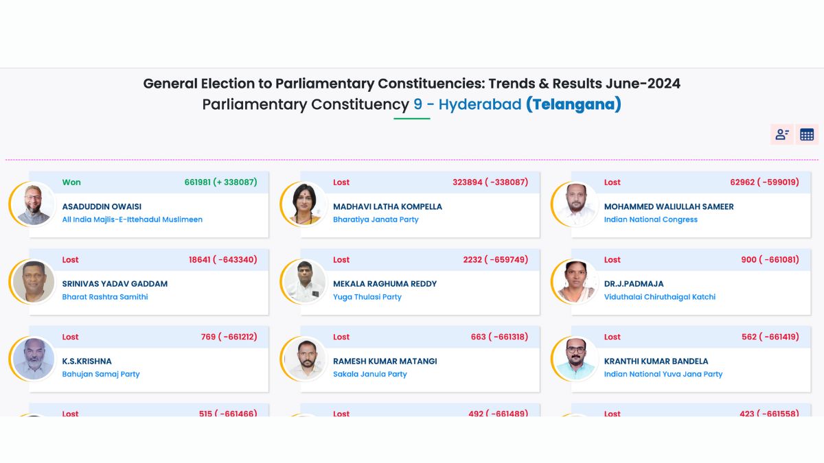 AIMIM candidate Asaduddin Owaisi is on course for a win over BJP candidate Madhavi Kompella in the Hyderabad constituency, leading by 3,38,335 votes according to current results.
