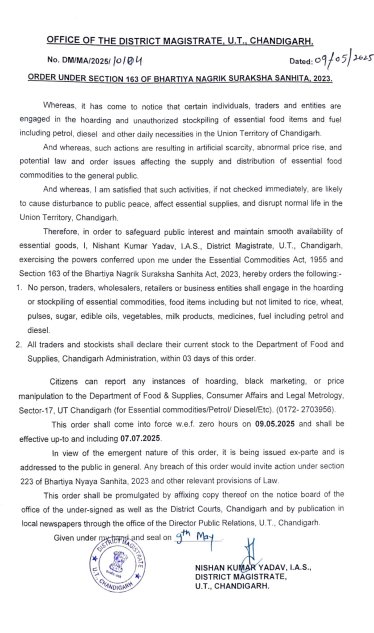 Chandigarh District Magistrate has banned hoarding of essential commodities (rice, wheat, sugar, fuel, etc.) under the Essential Commodities Act. Traders must declare current stock to the Department of Food & Supplies within 3 days.
