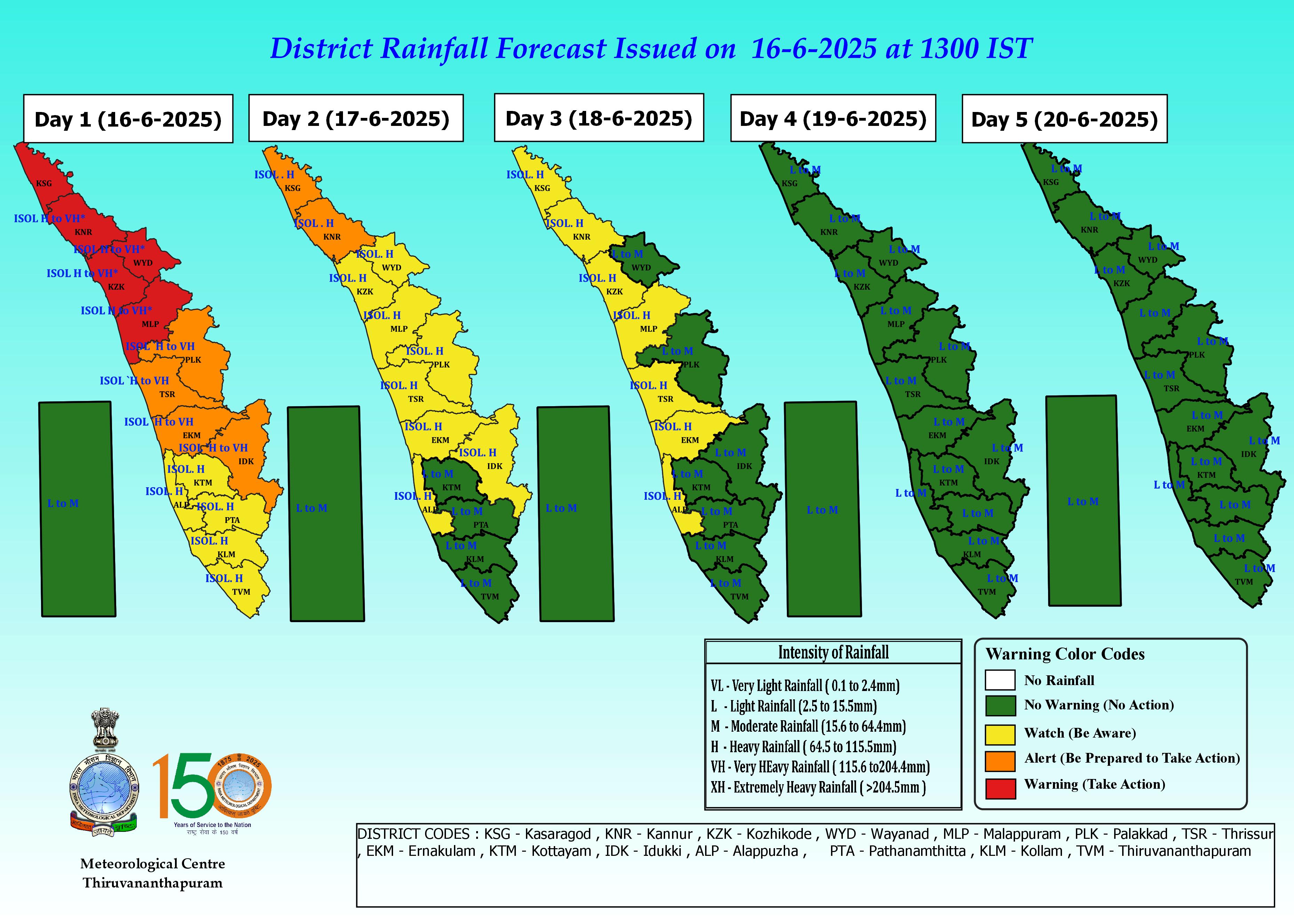 The Meteorological Centre placed five out of eleven districts of Kerala under a red alert warning on June 16 as they encountered extremely heavy rains. On June 17, only two districts are under an orange alert.