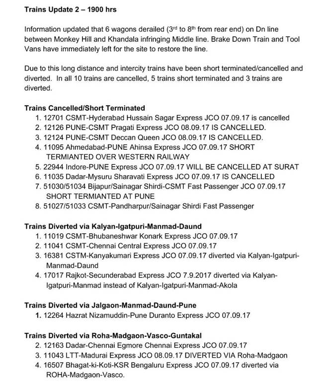 The release issued by the department specifically mentioned that 6 wagons of the goods trains, 3rd to 8th from rear end, derailed on down line between Monkey Hills and Khandala affecting the middle line. The release also stated that a breakdown train and tool van immediately rushed to the site to restore the lines. Due to this, long distance and intercity trains have been short terminated/ cancelled and diverted, said the release adding that in all 10 trains were cancelled, 5 short terminated and 3 diverted.