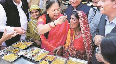 Raje launched the scheme by feeding a morsel to a Dalit and Gurjar woman at Jaipur Municipal Corporation campus. The CM also enjoyed “bajre ki roti, lassun ki chutney and besan gate ki sabzi” along with the two women, said a state government release.