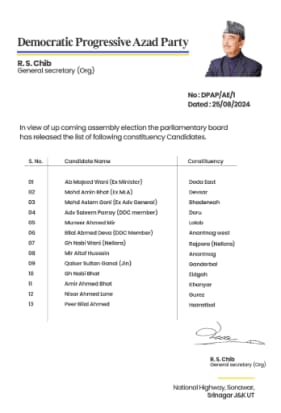 The Democratic Progressive Azad Party (DPAP) has released its first list of 13 candidates for the upcoming assembly elections in Jammu and Kashmir. This marks the party’s maiden assembly elections, as it was floated by former chief minister Ghulam Nabi Azad. The party’s general secretary (organisation), R S Chib, released the list of candidates.