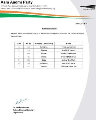 Meanwhile, the Aam Aadmi Party (AAP) has announced its list of seven candidates for the upcoming assembly elections. The Delhi-based party will field the following candidates: Bilal Ahmed Deva (Anantnag West), Ghulam Nabi Wani (Rajpora), Mir Altaf Hussain (Anantnag), Qaiser Sultan Ganai (Ganderbal), Ghulam Nabi Bhat (Eidgah), Amir Ahmed Bhat (Khanyar),Nisar Ahmed Lone (Gurez), Peer Bilal Ahmed (Hazratbal).