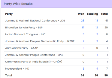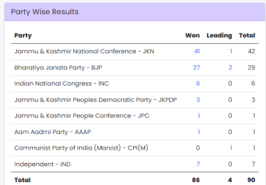 As of the latest update, results for 86 seats in the Jammu and Kashmir Assembly elections have been declared. Check here