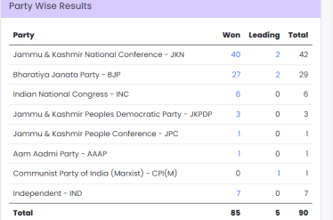 The NC-Congress alliance has emerged as a significant force in the recent elections, winning 42 seats. With their strong performance, they are now just three seats short of the majority needed to form the government. This puts them in a favorable position as they work to consolidate support and finalize their strategy for governance in the region.