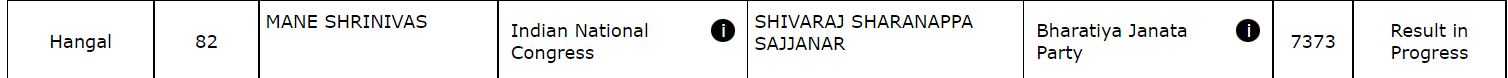 In Hangal, Congress candidate Mane Shrinivas got 87490 votes while the BJP's Shivaraj Sharanappa Sajjanar got 80,117 votes. JDS candidate Niyaz Shaikh polled only 923 votes.