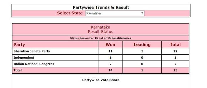 According to the Election Commission's trends, the BJP leading in 10 seats, Congress and JDS leading in 2 seats each, Independent -1. Counting is underway in 15 assembly seats.