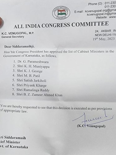 Congress MLAs Dr G Parameshwara, KH Muniyappa, KJ George, MB Patil, Satish Jarkiholi, Priyank Kharge, Ramalinga Reddy and BZ Zameer Ahmed Khan will also take oath as Cabinet minster, the Congress party said.