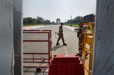 Security personnel guard at the Kartavya Path ahead of the launch of the revamped Central Vista Avenue in New Delhi, Thursday, Sept. 8, 2022. (PTI Photo/Manvender Vashist Lav)