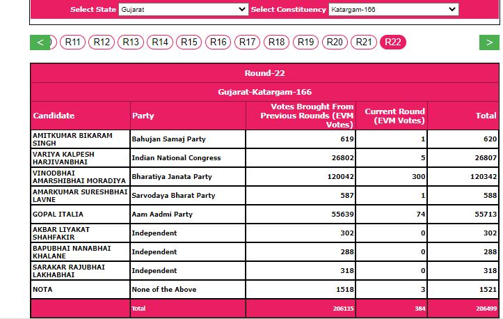 BJP candidate Vinod Moradiya is leading from the Katargam constituency number 166, getting 43,874 votes so far and AAP's Gopal Italia has so far got 25,971 votes.