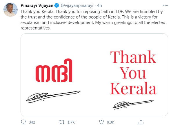 Kerala Chief Minister Pinarayi Vijayan thanked the people of Kerala for reposing faith in LDF. 'We are humbled by the trust and the confidence of the people of Kerala. This is a victory for secularism and inclusive development. My warm greetings to all the elected representatives,' he tweeted.