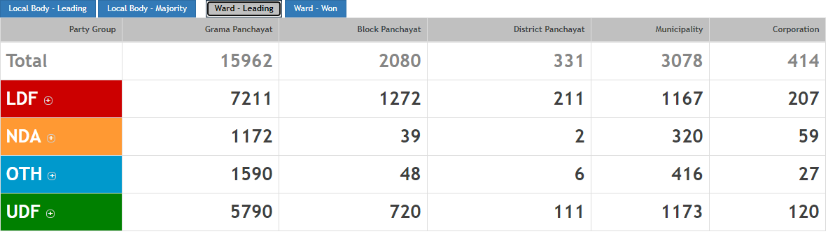 As per latest trends, ruling LDF is ahead in gram, block and district panchayats. Latest numbers