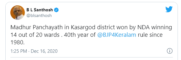 BJP General Secretary BL Santhosh: Madhur Panchayath in Kasargod district won by NDA winning 14 out of 20 wards . 40th year of BJP rule since 1980.
